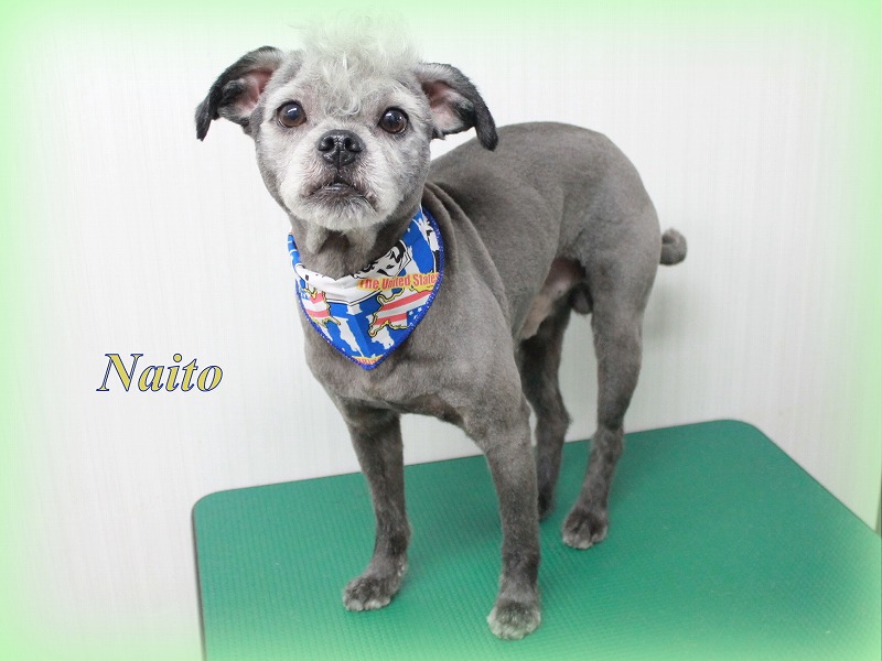 愛知県清須・西区・北名古屋市周辺でMIX犬のトリミングはプリティーワン チワワ×パグMIXのナイトちゃん 体2ミリのバリカンで丸刈り 耳・しっぽ2ミリ、お顔短ーーーく 頭モヒカンカット 写真では分かりにくいですがくるんとカールしたまつげが可愛いんです ナイトちゃん おつかれさま~