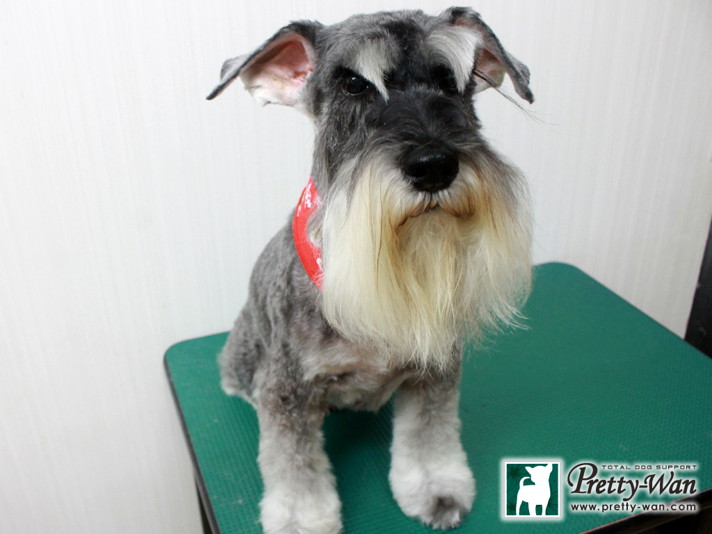 愛知県清須・西区・北名古屋市周辺でMシュナウザーのトリミングはプリティーワン Mシュナウザーのあけみちゃん 体2ミリのバリカン、足ややブーツカット ヒゲそのまま、まゆげとがらせる まゆげがシャープにとがっているけど 性格は丸い大人しいあけみちゃん 今回も頑張ってくれてありがとう