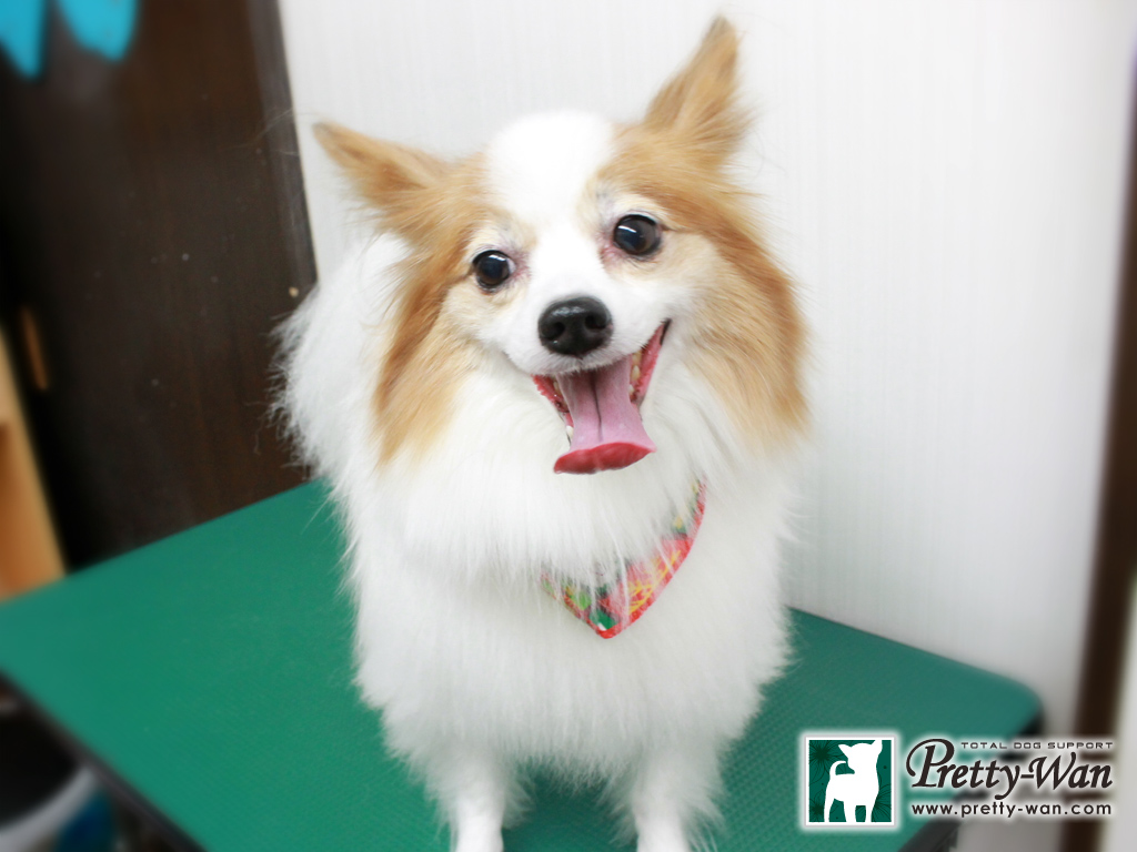 愛知県清須・西区・北名古屋市周辺でパピヨンのトリミングはプリティーワン パピヨンのニスモちゃん 毛量が多いから毛玉ができやすいね 毛玉を取り、しっかりシャンプーをしたら ふわっふわのサラサラの毛になりました ゼオライト歯磨き頑張ったから 口臭もさわやかになったね~ ありがとうございました