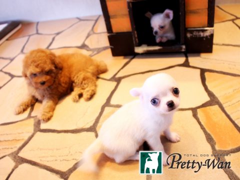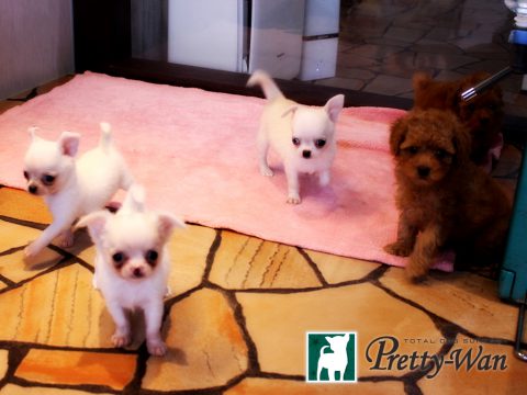 人気の高いカラークリームのスムースチワワがお店にデビュー! ママは店長の愛犬エマちゃん。 くりくりおめめの美人です。 エマベビーの特徴は 吸い込まれそうなくりっと大きな瞳です。 性格は少し警戒心の強い面もありますが、 飼い主に対して一途に愛情をそそいでくれます。 プレイルームにデビューして、社会化の勉強を開始しました。 ママに愛情をいっぱいもらい、 きょうだいと共に元気いっぱい成長しています。 キュートなエマベビーがプリティーワンで みなさまのご来店をお待ちしています(*^^)v
