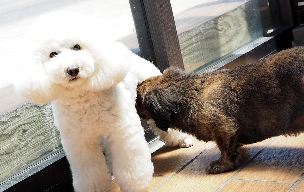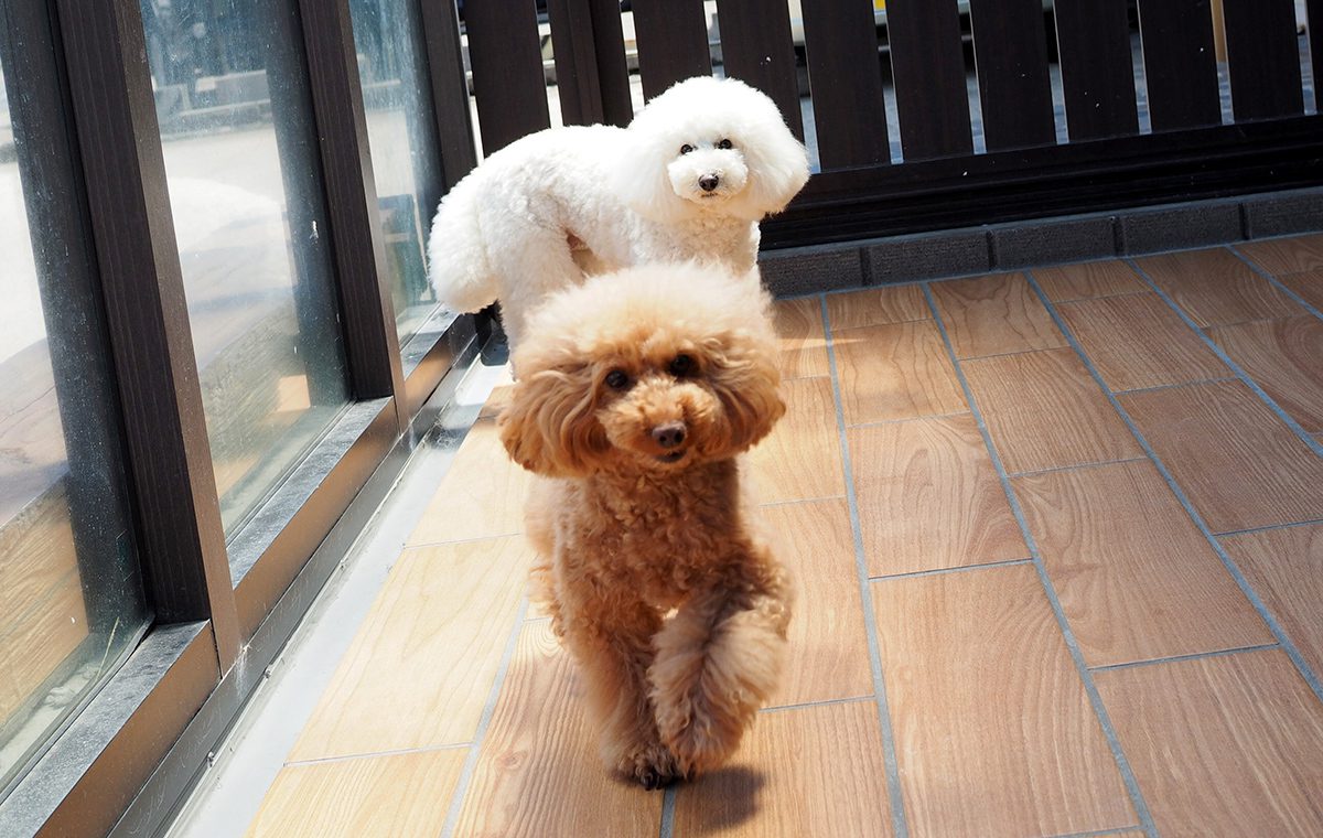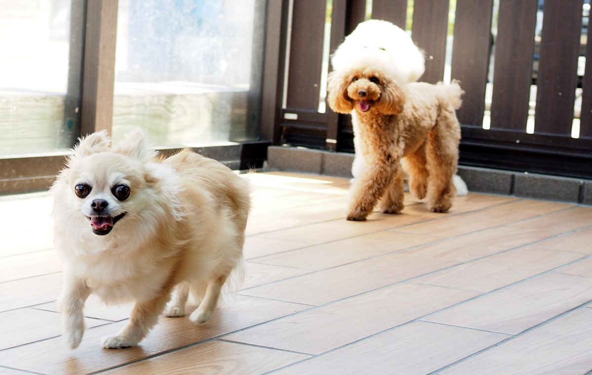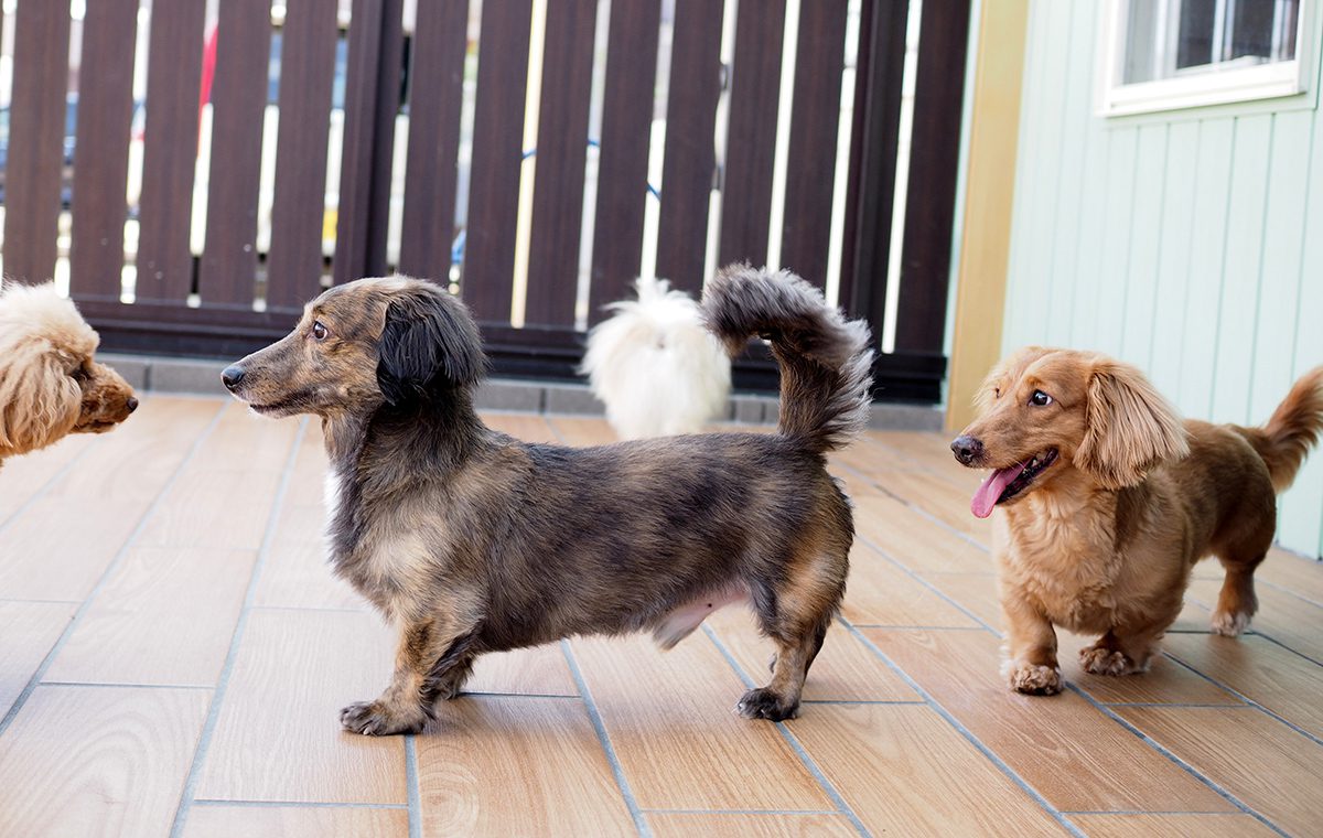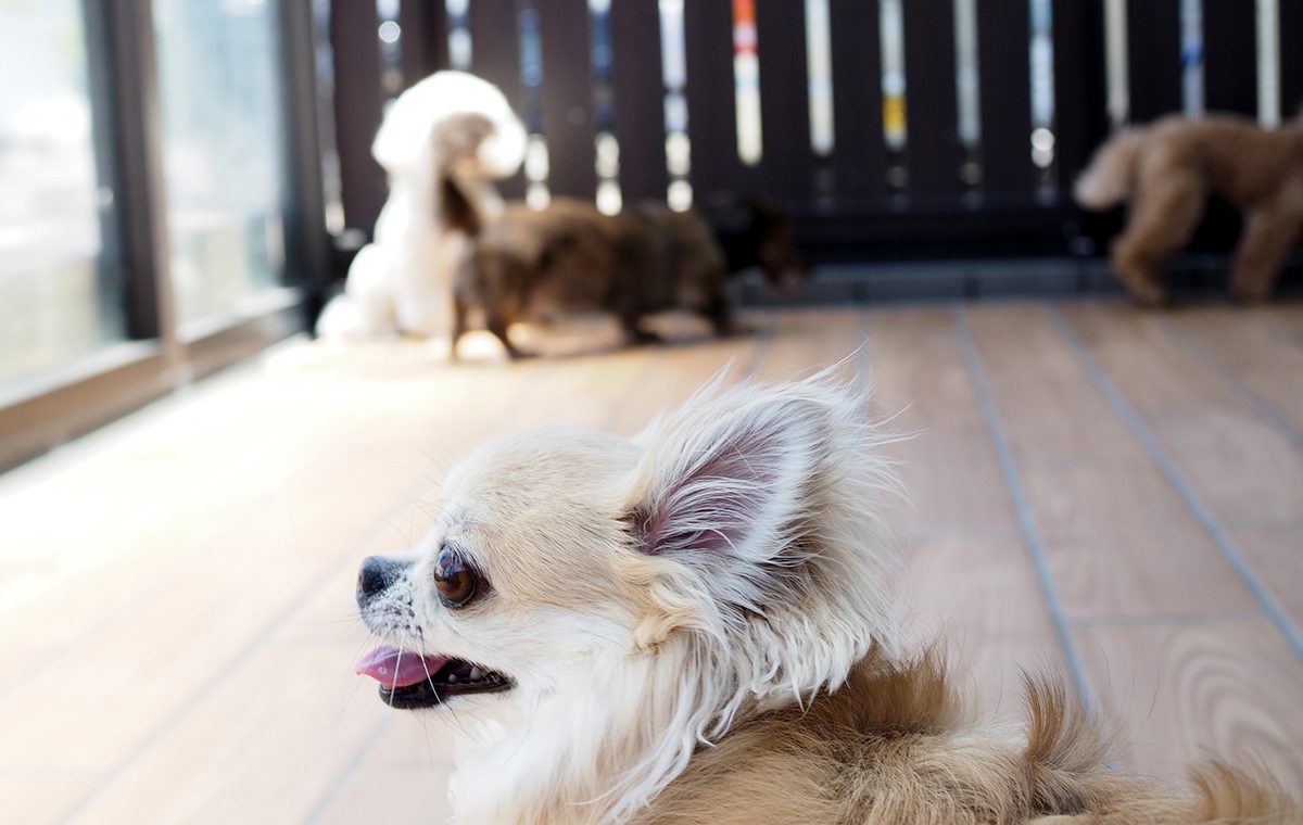 日中はテラスでのんびりと日向ぼっこして過ごすわんちゃんたち。